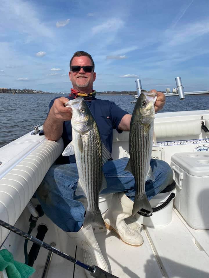 It wasn’t necessary to wait for today’s reports as I’m sure the wind and rain kept everyone home. However, there was a good report from Chuck Many about his Saturday afternoon and evening striper fishing in Raritan Bay as over 30 bass were caught by the crew of Nikki Bowden, Dave Glassberg and Capt. Lou Grazioso (see photo below). There was nothing big, as a 32-incher was the largest, but the action was the first reported on both bunker chunks and cast lures.