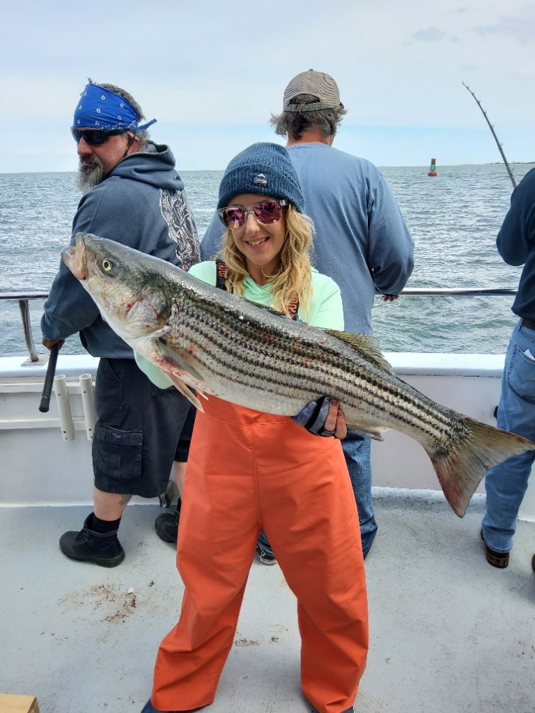 Scott Leadbeater had better news from Saturday morning’s trolling at the mouth of the bay with his Aquasport from Atlantic Highlands. It was cold, damp and drizzly, but trolling slowly with mo-jos produced a decent pick of mostly 30-34-inchers despite the big fleet.