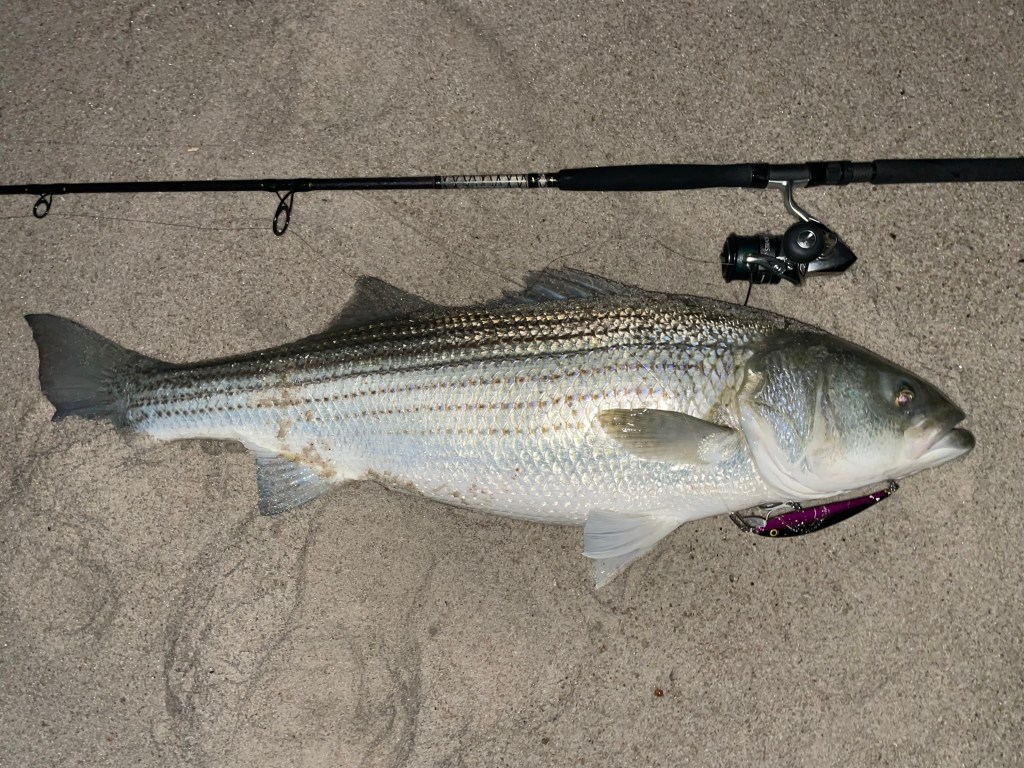 Clam baits accounted for the IBSP stripers, but the best was yet to come as Nick Honachefsky fished the surf during the eclipse of the moon that night to release a striper probably over 40 pounds on a purple Bomber plug. He didn’t have official measurements, but used his fingers to come up with the 48-inch length and 28-29-inch girth that would put it over 40 pounds. See the photo below. Two others were lost due to the small hooks on the Bomber.