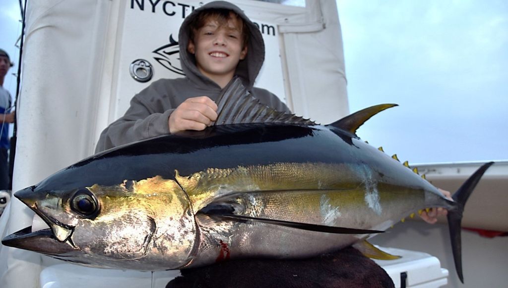 Oliver McMurry with his first yellowfin tuna caught on a popper after his father had a cancellation and took his son out instead. Oliver had a broken foot, but fought the tuna unaided.