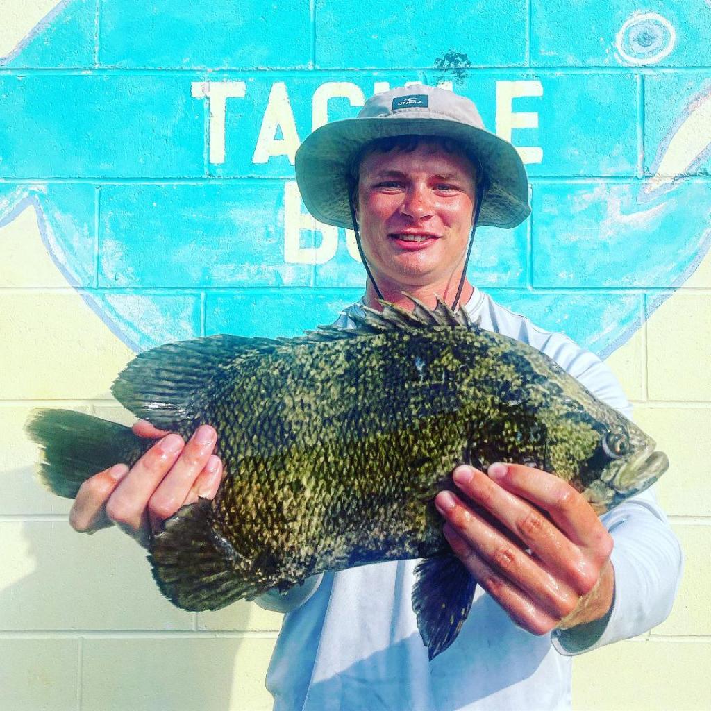 Many southern species move north in late summer, but I never heard of a tripletail in N.J. before. I’ve only fished for them in Florida around channel markers and crab trap buoys, but they’re actually oceanic fish which hang around weed lines and floating debris. That’s where Steve Caponi of Hazlet found one that hit a Tsunami Shad being cast to school dolphin offshore of Highlands. Steve weighed the 17 1/2-incher in at the Tackle Box in Hazlet at 3 1/2 pounds. Though the state doesn’t have a record for the species, Steve is submitting it for such a designation.