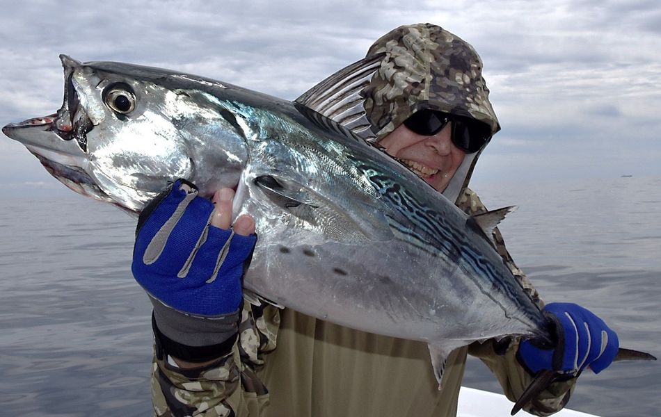 Surprisingly. I haven’t heard of shark attacks on even large little tunny such as this one held by Capt. John McMurray. Maybe the sharks have heard they’re not good eating!