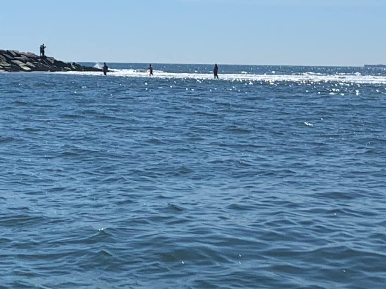 Jones Inlet was my first challenge as a young Long Island boater, and has continued to be a problem off and on many times over the years. Surfcasters were making use of the east side yesterday, and Capt. John McMurray says that side isn’t even usable at high tide — though it’s possible to sneak out then on the west side.