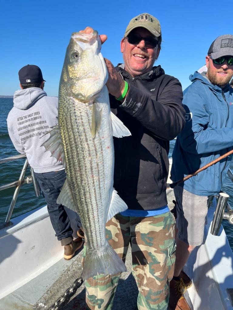 Capt. Ron Santee got into bass all alone with his Fishermen from Atlantic Highlands right away It got nasty when the wind came up against the current, and Santee went back to the bay where bass continued to hit in more comfortable conditions. Almost everyone had a keeper and slot, and some caught in double digits.