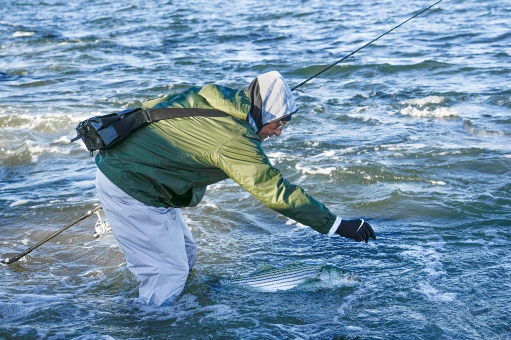 Tom Lynch of Angry Fish Gallery in Point Pleasant took this shot of John Tidemann landing a school striper in the Jersey surf this week
