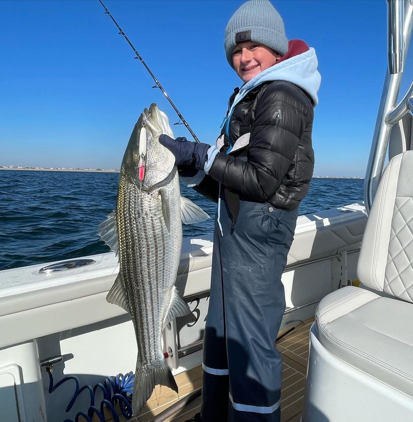 A small craft warning is up from late tonight through Sunday evening. West winds in the morning at 25-30 knots plus gusts to 35 are fine for NJ surfcasters, but will force boaters to fish very close to the beach — just as Capt. Dave DeGennaro did this morning with his Hi Flier from Barnegat. He had two hours of no fish and 20 miles of running north before getting into explosions of school stripers which produced great popper action. See photo below.
