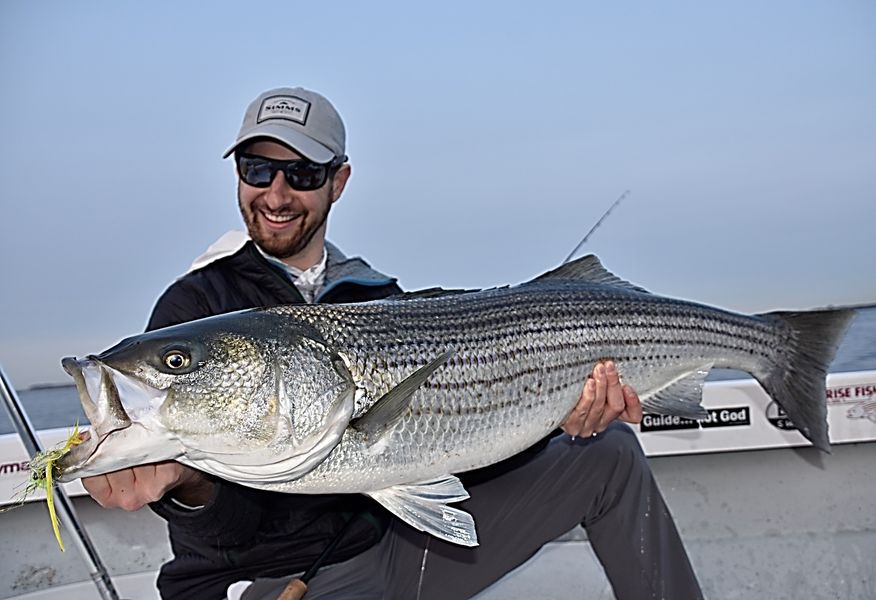 NYC charter skipper John McMurry got into very cooperative stripers yesterday that jumped on flies and plugs. The largest was a 45-inch fork length bass on fly pictured below.