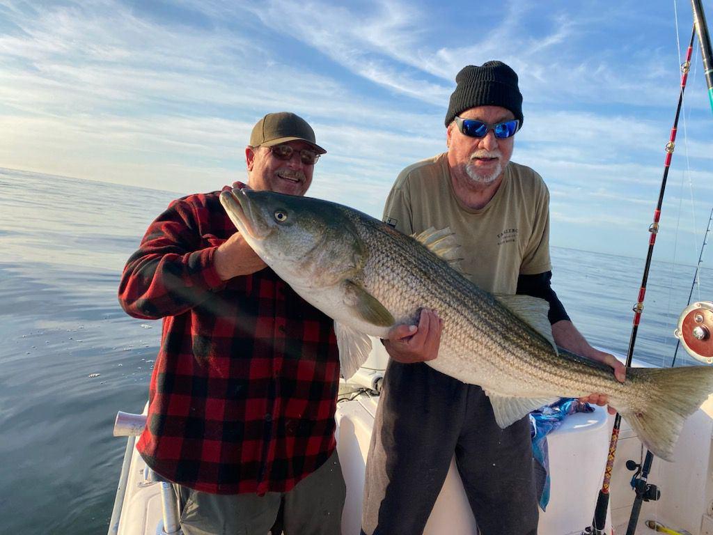 Vinny D’Anton reports a pick of legal stripers on sand fleas in the Monmouth County surf.