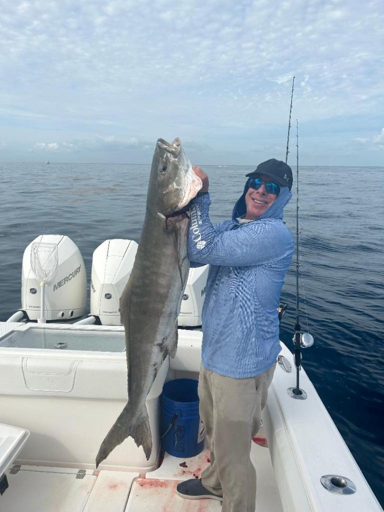 A bit further south – Bob Correll of Bay Head and Hutchinson Island, FL with a 50-pound, 52-inch cobia he jigged offshore of St. Lucie Inlet on his new 34-foot Sea Vee with triple 150 hp Mercs and a Seakeeper. My son-in-law, Luis Gonzalez, released a sailfish on a live bait while my nephew was fighting his cobia.