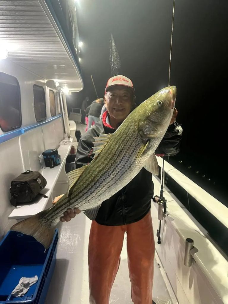 Kil Song with a striper on eels aboard Ebb Tide at Montauk during the night trip — and then with a fluke during the morning trip