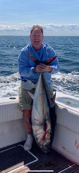 Kil Song warmed up for giant tuna fishing in Cape Cod Bay yesterday with this yellowfin from Westport, Massachusetts — but lost two giants estimated at 300-400 and over 550 pounds with Jimmy the Greek this morning.