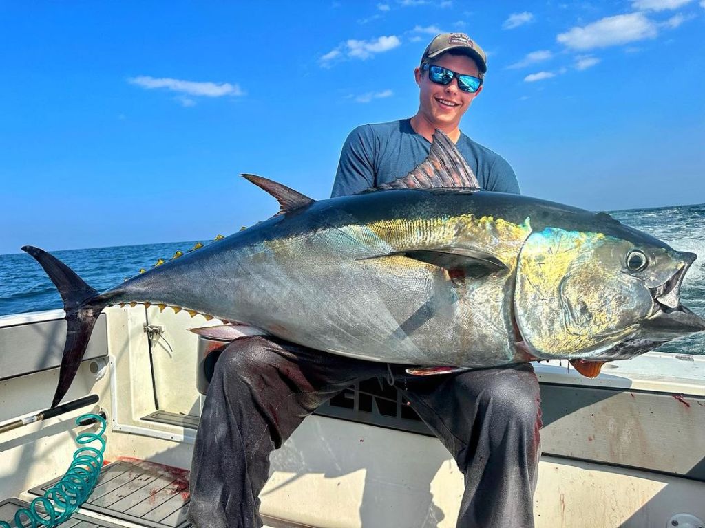 The inshore bluefin run continues to be impressive. Shore Catch has been boating those 55 to 68-inch tuna regularly. Mate James Tafaro shows off a typical bluefin