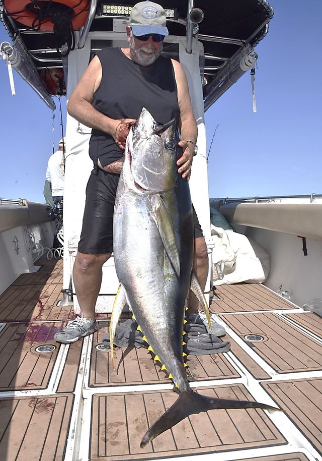 NYC Capt. John Mc Murry reports yellowfin tuna are well within range and bigger than ever. He estimated the 63-incher shown to be 125-150 pounds. Poppers have been most effective– and you can imagine what a thrill it is to get a surface strike from a fish like that! Fortunately, the relatively shallow depths to the east are in the angler’s favor. Years ago, I hooked a 170-pounder off Panama on a popper that went down to the “bottomless” depths of the Pacific and tied me up on spinning tackle for 5 1/2 hours.