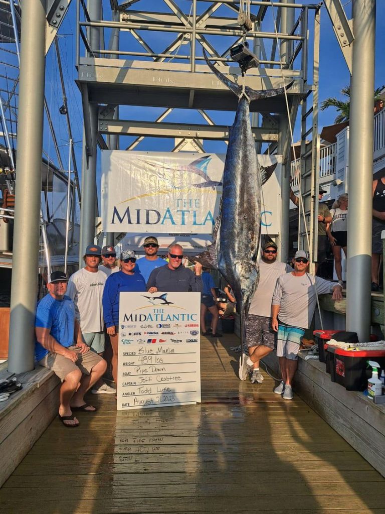 The 489-pound blue marlin boated on Pipe Down during yesterday’s first day of the MidAtlantic was a great catch, but actually well short of the day’s best — if it had counted. As Jeff Merrill of the MdiAtlantic noted “The hard luck award for the day and possibly even the tournament goes to Captain Danny Veid of Tarpon Springs, Florida aboard Amarula Sun. The crew hooked up a huge blue marlin about an hour before lines out and fought the massive billfish before getting it to the boat and cleanly placing two fly gaffs into her. Unfortunately, the marlin then tried to free itself from the gaffs and in the process got caught in the propellers mutilating the fish. The MidAtlantic follows IGFA rules which clearly states mutilated fish are disqualified. Worthy of note the crew of the Amarula Sun self-disqualified the fish which after weighing still pulled the scale down to 808 pounds!”