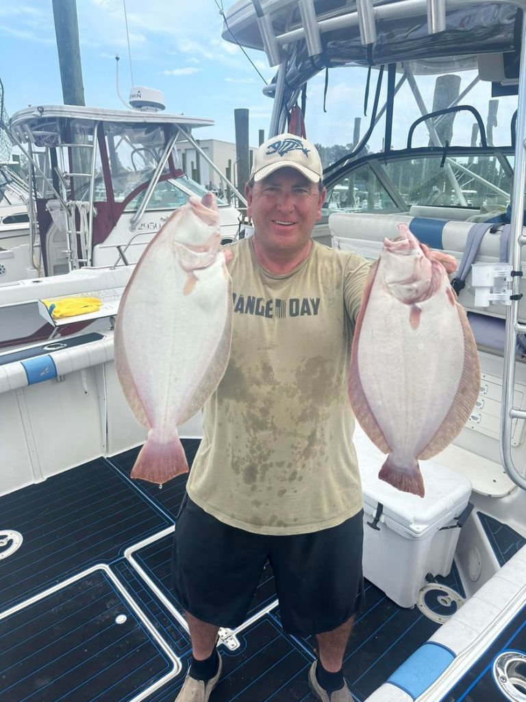 Alberto Zacchino with a couple of fat fluke on his boat out of Belmar.