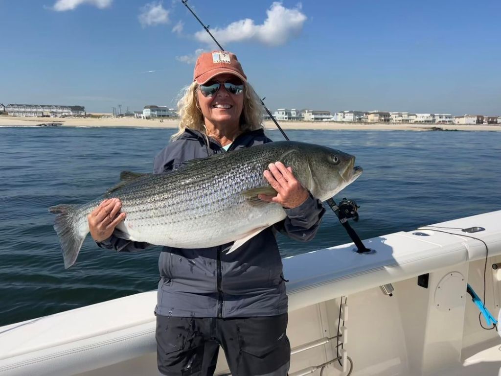 Ginger Tatum fished with Gary Caputi and Kris Trasborg to put a Gray Fish Tag in this 47-inch striper