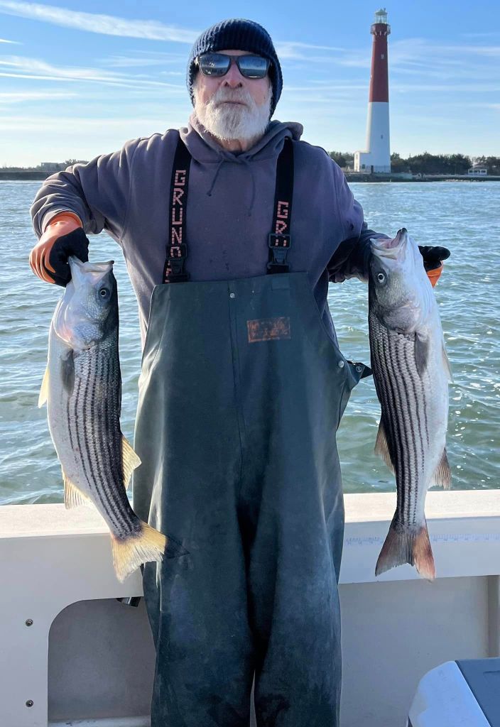 Jim Hutchinson Sr. says age is only in your mind. Dave Rinear and he went out of Barnegat Inlet in sub-freezing temperatures to catch 15 stripers in less than an hour before returning with their limits Dave is the young guy at 79!