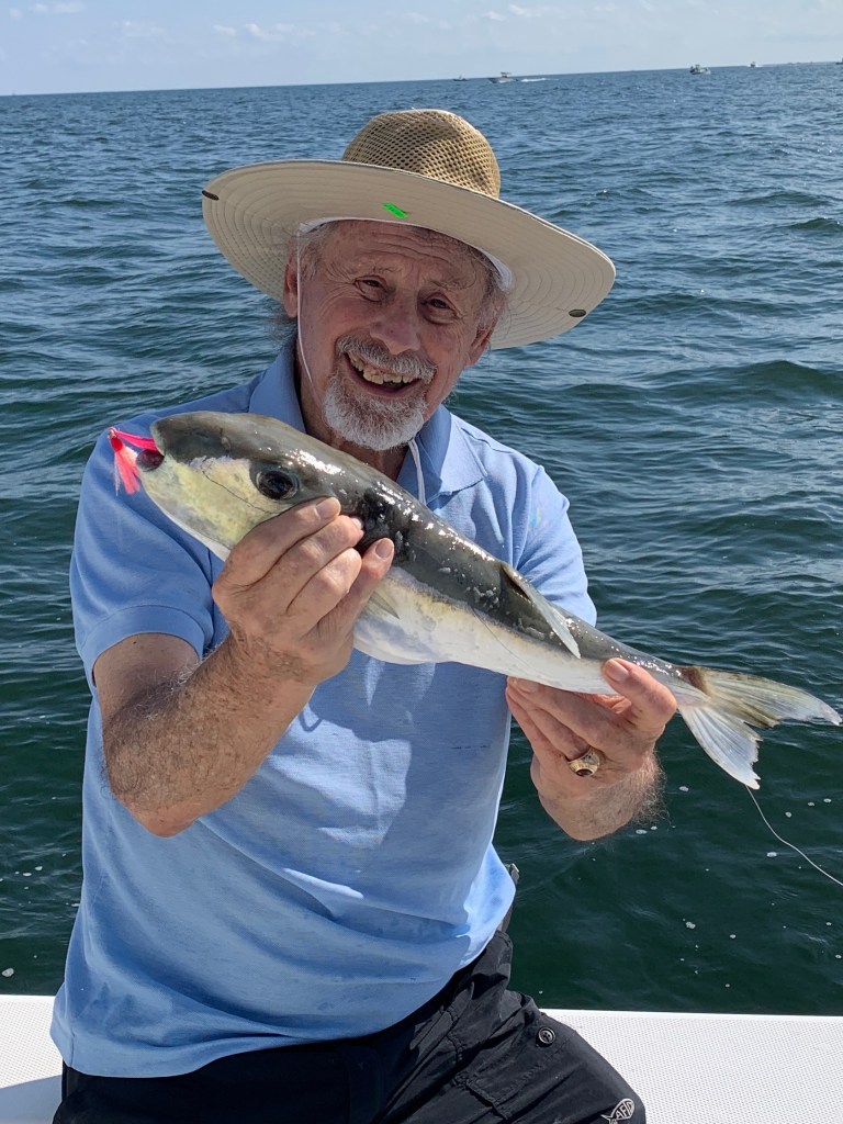 My first saltwater fish was a blowfish caught from a rowboat at Freeport, Long Island, and i caught many more growing up on the south shore as the northern puffer cycle was at a peak during the 1950s. At that time, I also read about N.J. bay fishermen being surprised by a much larger puffer that they called rabbitfish. It was decades later before I ever caught that puffer which is properly called smooth puffer – and that was a small one from a wreck off Key West. Last Friday I caught a bigger one while fishing with Bob Correll on his Sea Vee 32 out of Hutchinson Island, Florida in the mouth of St. Lucie Inlet. (see photo at end of page0