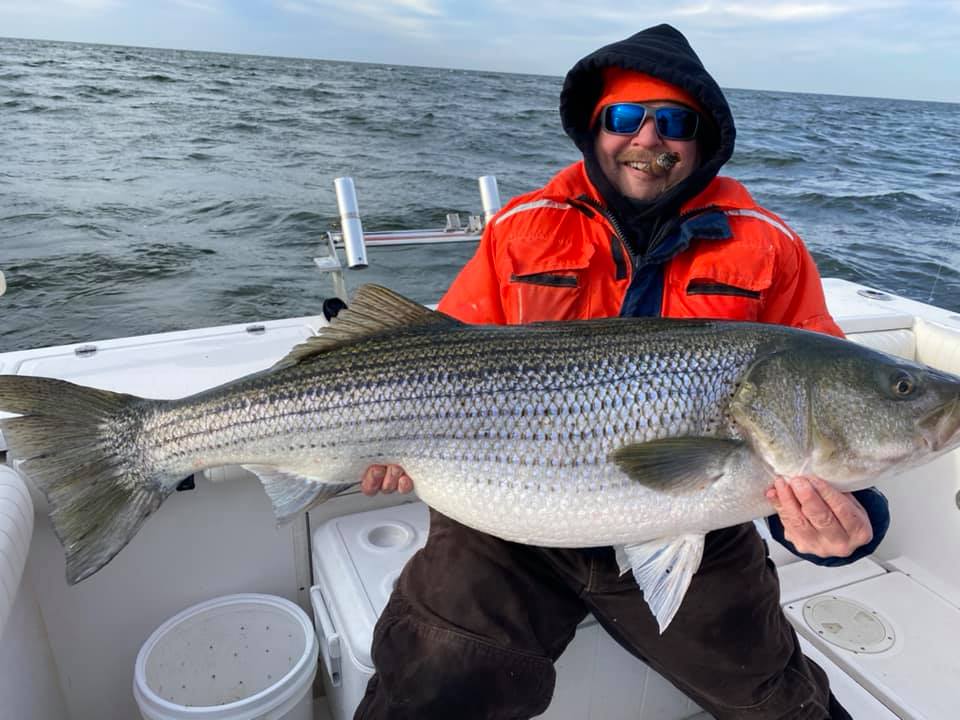 The striper below was released by Chad Parks on Chuck Many’s Ty Man from Cape Charles, Va. and will be a lot lighter after she sheds her roe in the spring and that belly flattens out. The only hit of the day — but well worth the trip trolling live eels.