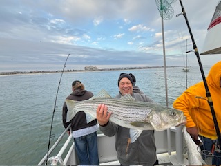 Capt. Jim Freda got his Shore Catch charter into big stripers off Manasquan Inlet where they also saw bluefin tuna blasting into schools of bunkers.